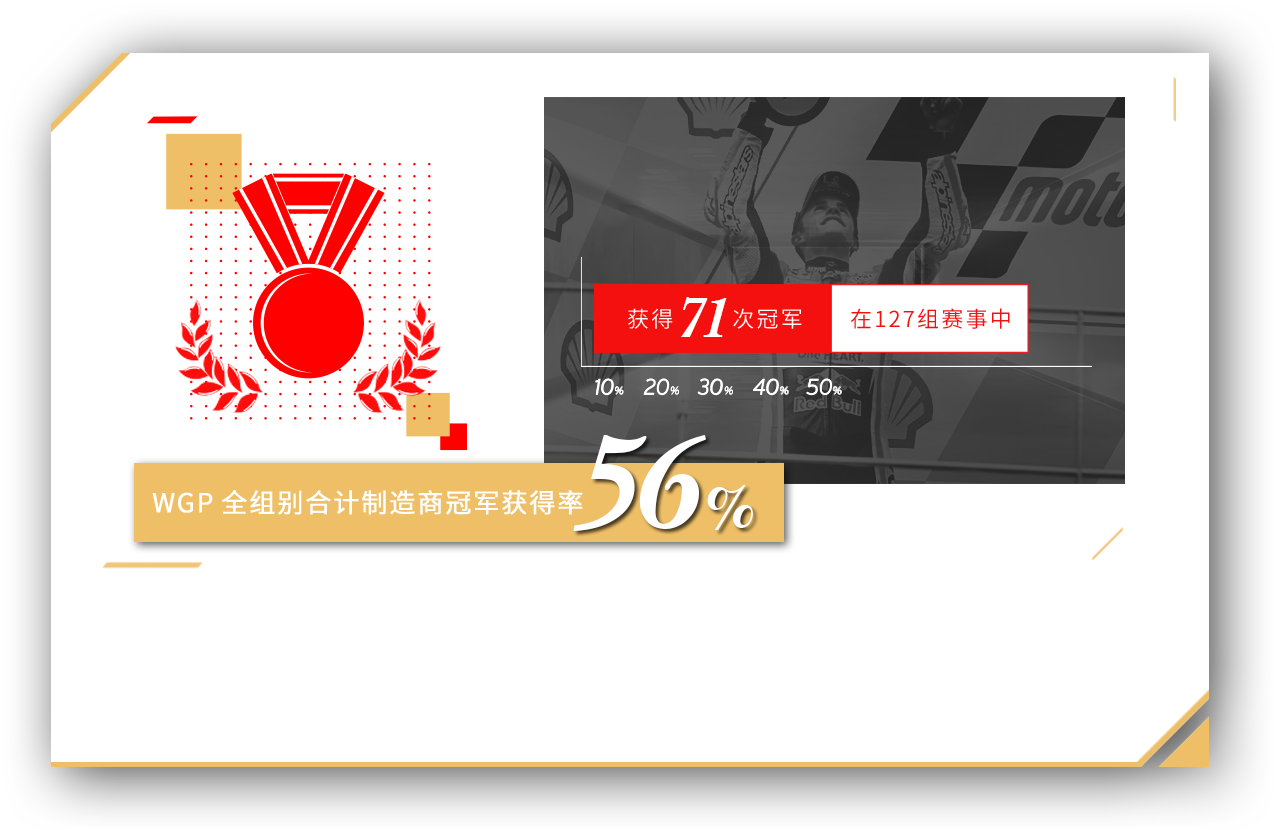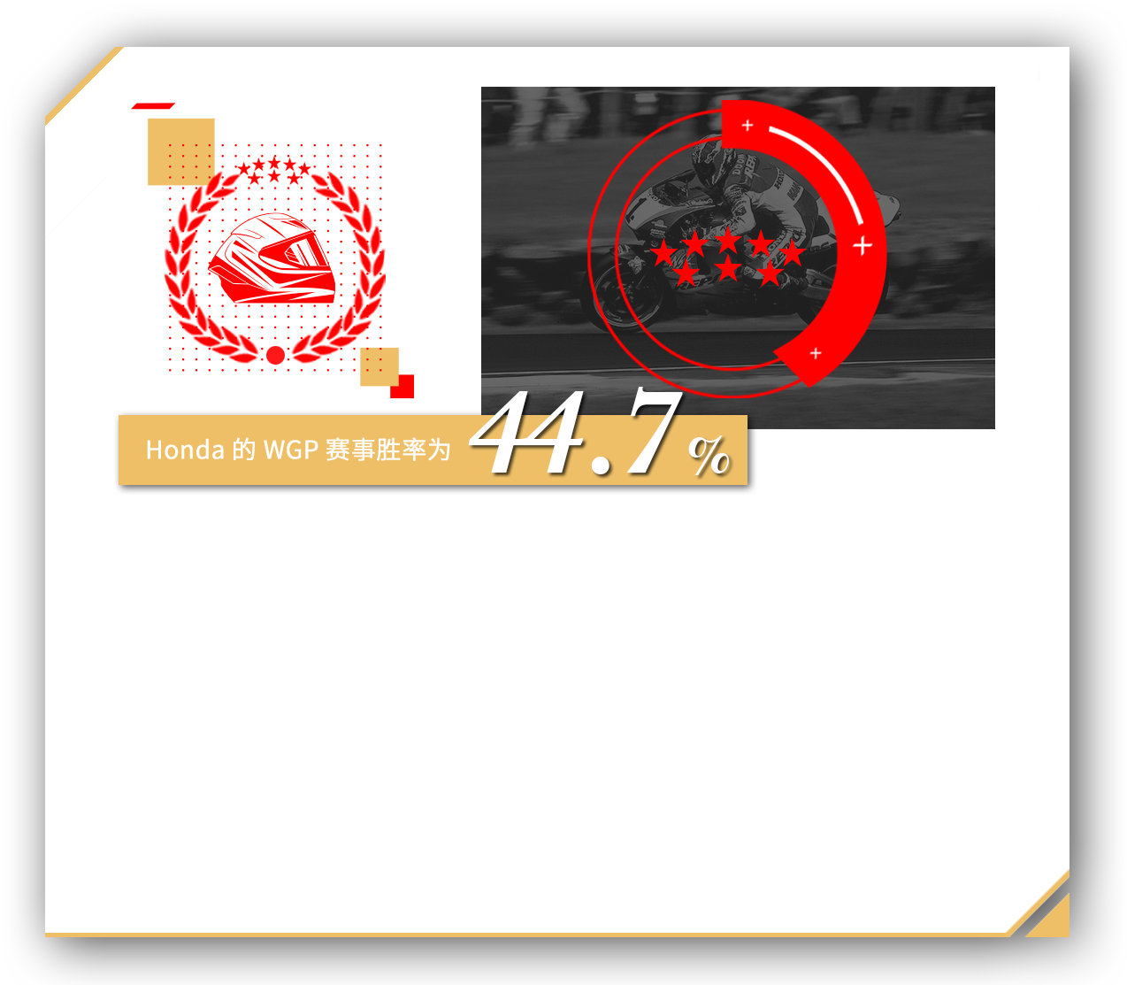 1959年~2020年之间Honda所参加的WGP的127个各种组别的赛事当中,赢得了71个制造商冠军。Honda的赛车拥有优势。