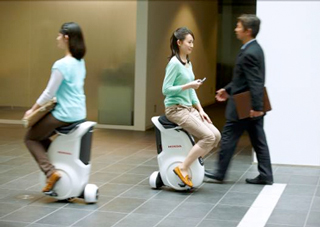 “UNI-CUB”是2009年公布的个人移动工具“U3-X”的升级版本。它利用Honda独有的平衡控制技术和全方位车轮驱动结构(Honda Omni Traction Drive System),仅凭借倾斜身体、转移重心便可调节速度和方向。除前后移动外,还可实现左右、斜线等各个方向的移动、转弯和停止,因此能够敏捷配合周围人群的行动。
