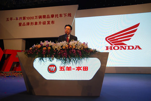2013年4月11日,随着一辆新优悦从生产线上缓缓而来,五羊-本田摩托(广州)有限公司(以下简称五羊-本田)迎来了第1000万辆车荣耀下线。Honda中国本部长仓石诚司等领导以及五羊-本田经销商、员工代表等共400人共同见证了这一历史时刻。