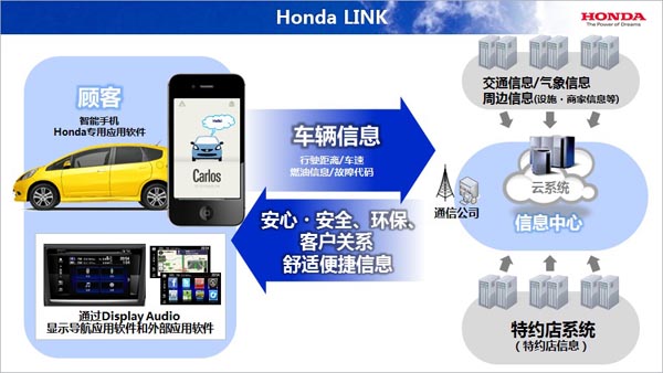Honda还计划三年内在中国推出Honda Link系统,这种基于导航硬件的先进信息通讯系统可以通过智能手机与Honda的云系统交换信息,云系统中保存了各类最新信息与数据,顾客可以随时将自己所需要的信息接收到车载显示屏上。