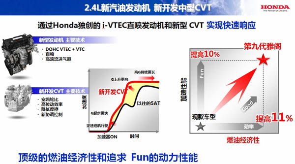 新开发的2.4L汽油发动机采用了Honda独创的i-VTEC技术和直喷系统,同时,提高了CVT的传动效率,降低了摩擦,在提升燃油经济性的同时,实现了极高的反应灵敏度。通过这些新技术,可以获得高效的燃油经济性和远超越以往车型的动力性能与灵敏反应,兼顾了环保和驾驶乐趣。新款2.4L汽油发动机被权威汽车杂志《Ward’s Auto world》选入年度十佳发动机。这套动力系统将在今年9月上市的第九代雅阁上搭载使用。