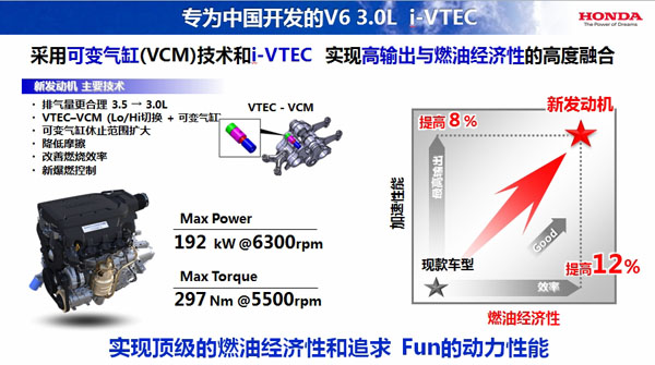 Honda专为中国市场开发了新款3.0L V6发动机,新款发动机采用智能可变气缸(VCM)技术和i-VTEC系统相配合,动力输出比现有V6发动机有了很大提升,同时还大幅降低了油耗。新开发的3.0L V6发动机也将搭载在新款第九代雅阁上。