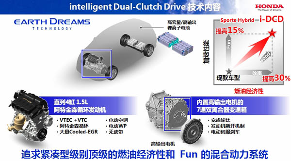 i-DCD(intelligent Dual-Clutch Drive)是一套最适合紧凑型汽车使用的单电机混合动力系统,该系统以1.5L阿特金森循环i-VTEC汽油发动机为基础,配合内置高功率电机的7速双离合变速器和锂离子电池,形成了高效的电动驱动系统。搭载这一系统的紧凑型汽车将具备同级别最强大的加速性能,实现驾驶乐趣的同时,获得同级别全球顶级的燃油经济性。