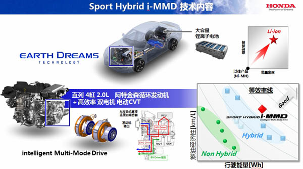 i-MMD(intelligent Multi-Mode Drive)是一套最适合中型车使用的,具备高效率的双电机混合动力系统。该系统采用2.0L阿特金森循环汽油发动机和新开发的高效、高功率双电机电动CVT,外加锂离子电池。i-MMD的工作效率(汽油的投入热能和行驶耗能之比)远超越以往的混合动力车型。