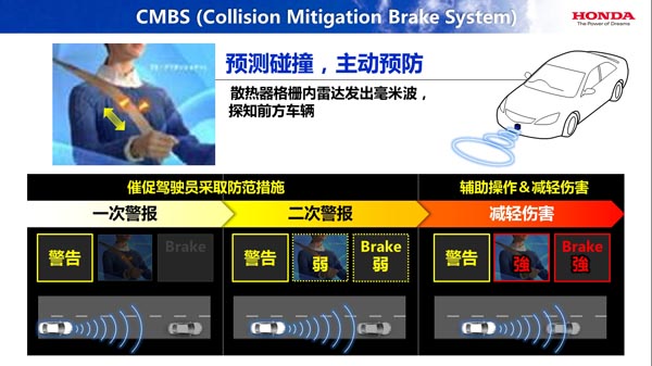 为了进一步减少事故的发生,就需要“避免碰撞”和“主动预防”等新技术,也就是避免并预测预知事故的安全技术。首先是CMBS(Collision Mitigation Brake System)防碰撞制动系统,该系统利用微波雷达探测前方车辆,提醒驾驶员躲避危险,还可以自动启动刹车以减轻碰撞伤害,CMBS(Collision Mitigation Brake System)防碰撞制动系统是Honda全球首创的安全技术。