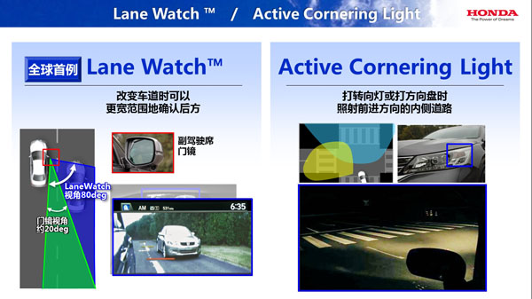 Honda全球首创的Lane Watch盲点显示系统在后视镜前部安装摄像头,可以在显示屏上看到位于视野死角内的车辆。