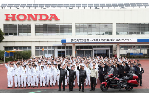 2014年9月,Honda全球第3亿台摩托车“2015款金翼”在熊本制作所下线,标志着Honda摩托车全球累计产量突破3亿大关,取得了一个具有里程碑意义的成绩。为庆祝这一具有意义的时刻,作为生产工厂的熊本制作所今日举行了隆重的纪念典礼。