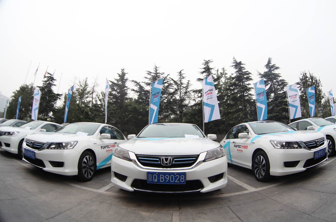 9月22日,Honda中国主办的FUNTEC HYBRID“一箱油,Go!”城市间挑战赛在北京举行发车仪式,由爱卡汽车、汽车头条、蜂鸟网、蚂蜂窝网和雅阁车主代表组成的五支车队,整装待发,驾驶搭载高效节能双电机混合动力系统i-MMD的混合动力版雅阁,一路向西,挑战只用一箱油从北京行驶到银川!