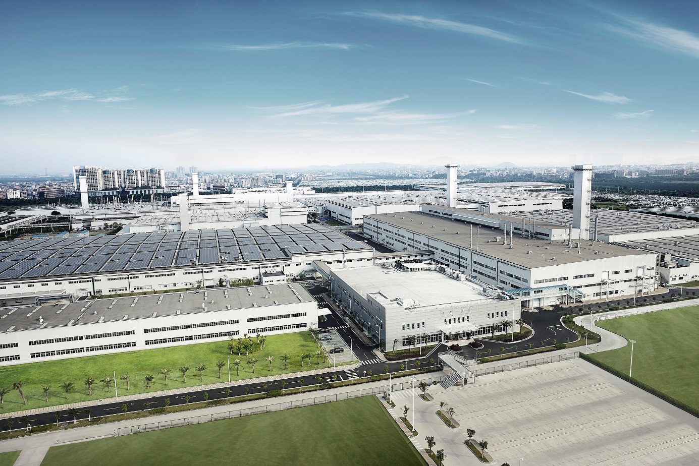 简练、紧凑的工厂。第三工厂由于主要负责生产小型车,第三工厂暨发动机工厂全面配合小型车特点,将现有的增城工厂厂房和设备进行最大化活用,采取最合适的“一型”布局,活用现有建筑物(包括冲压车间、焊装车间、合成树脂车间、试车跑道、生产停车场与动力基础设备),实现人行、物流、完成车不交叉,减少了移动浪费,同时预留了将来能扩的空间。