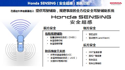 Honda SENSING(安全超感)系统针对车辆的前方新增加了碰撞缓解制动系统(CMBS)(行人/车辆感应)、车道偏移抑制、附带低速追随模式ACC,以及车道保持辅助系统(LKAS)等新功能。这些前方安全辅助功能,与迄今为止已经搭载应用的盲点显示(Lanewatch)、盲区监测等侧方安全辅助功能,和倒车出库辅助、后视广角摄像等后方安全辅助功能相结合,为驾驶者提供全方位的安全驾驶辅助,实现安全、安心、充满乐趣的驾驶体验。今后不断进化的Honda SENSING(安全超感)系统将成为未来自动驾驶的核心技术。