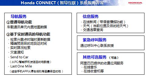 Honda CONNECT(智导互联)系统将为顾客提供10年免费服务(基本服务项目),免费范围包括基本导航、通讯费和紧急呼叫等服务项目。