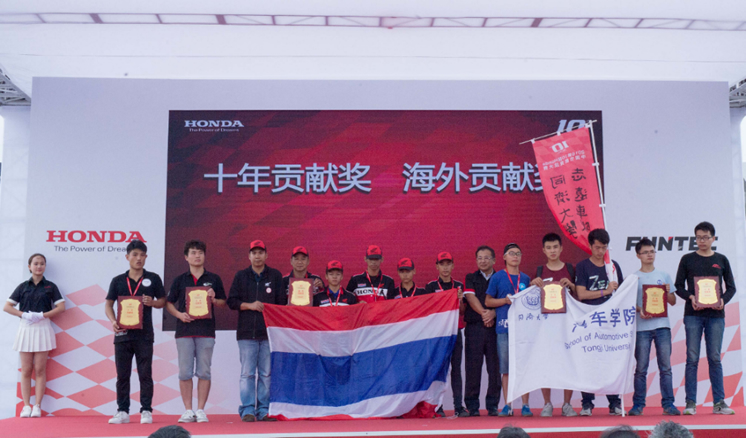 此外,大学、专科学校的最佳进步奖由西华大学的西华大学节能车队获得,该车队通过技术的改进,成绩较去年大幅提升;Honda关联企业的最佳进步奖由东风本田汽车有限公司的雷豹车队获得。今年新设的最佳新秀奖由泸州技师学院的鹘鹰车队(燃油)和同一学校的凌风车队车队(EV)摘得,首次征战,就成绩不凡。通过社交平台评出的最佳人气奖和洪荒之力奖,则分别被佛山科学技术学院的滨海号车队(大学、专科学校最佳人气)、广汽本田汽车有限公司的梦想EV2 队 (Honda关联企业最佳人气)、南京航空航天大学金城学院的零度车队囊括,凝聚各车队创造力和智慧的海报和视频获得了极高的关注。同时,在大赛十周年之际,还颁出了十年贡献奖,向一起走过十年的车队表示最由衷的感谢。
