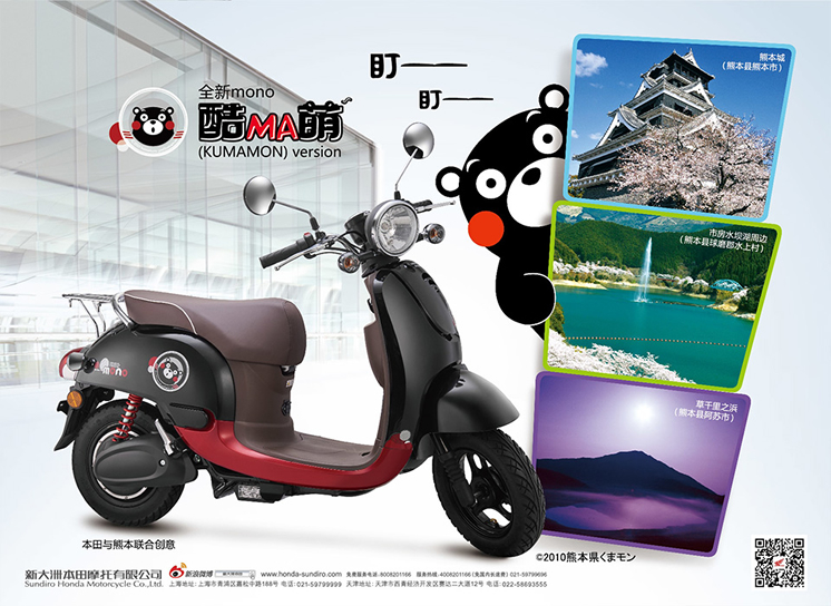 mono拥有5种靓丽的车体颜色,满足不同用户的需求;值得一提的是,此次新大洲本田倾心打造了mono特别版即Honda与熊本联合创意的酷MA萌版。熊本熊(官方中文名:酷MA萌)是日本熊本县营业部长兼幸福部长、熊本县地方的人气吉祥物。新大洲本田获得其授权,特别推出“酷MA萌版mono电动摩托车”。