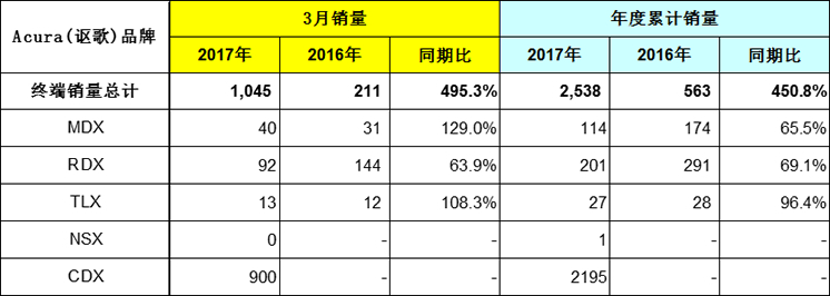 Acura(讴歌)品牌3月终端累计销量为1,045辆,去年同期比为495.3%。