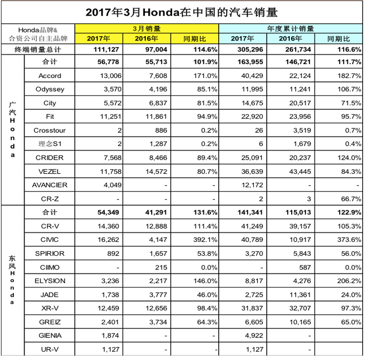 2017年4月6日,Honda发布2017年3月在中国的终端汽车销量。