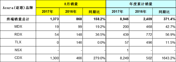 Acura(讴歌)品牌8月终端销量为1,373辆,去年同期比为158.2%。2017年1~8月终端累计销量为 8,946辆,去年同期比为371.4%。