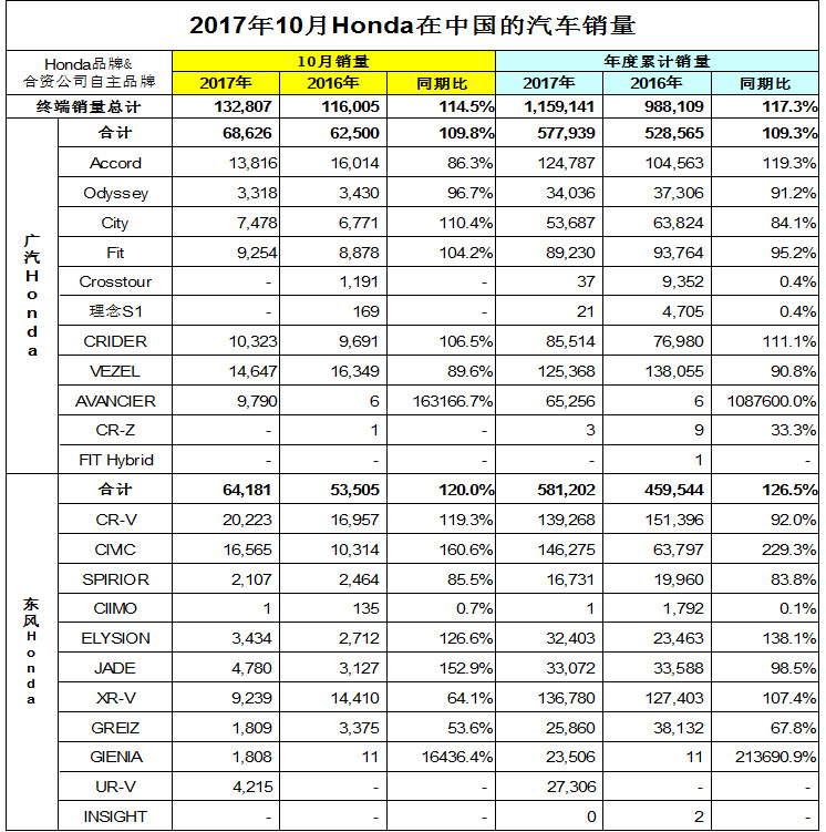 2017年11月2日,Honda发布2017年10月在中国的终端汽车销量。