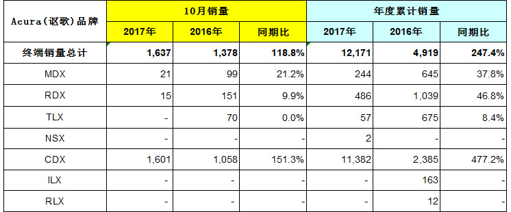 Acura(讴歌)品牌10月终端销量为1,637辆,去年同期比为118.8%。2017年1~10月终端累计销量为 12,171辆,去年同期比为247.4%。