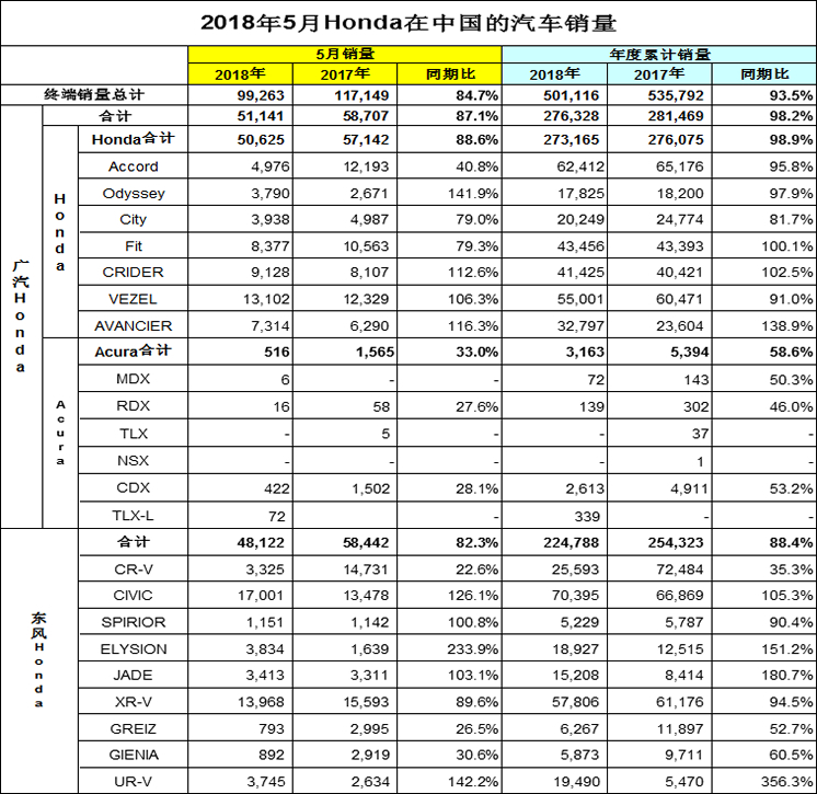 2018年6月4日,Honda发布2018年5月在中国的终端汽车销量。