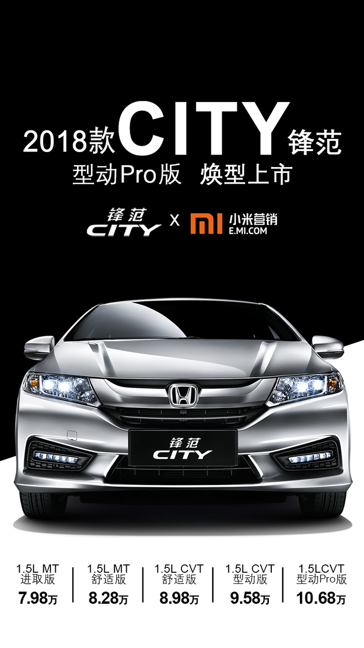 2018年6月21日,2018款CITY锋范智能交互发布会在线上举行。随着小米AI音箱的主持引导,2018款CITY锋范缓缓揭开“真面目”,新增型动版、型动Pro版,全系售价7.98万元-10.68万元,以更丰富的派生、更高的性价比和极致科技感,全面开启TECH X MODE世界观。