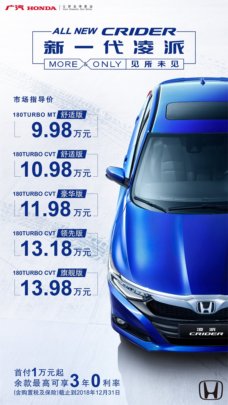 9月27日晚,2018广汽本田品牌之夜暨新一代凌派(CRIDER)上市及全新RDX预售发布会在广州举行。当晚,新一代凌派(CRIDER)惊喜上市,共推出5个版本,市场指导价为9.98-13.98万元。