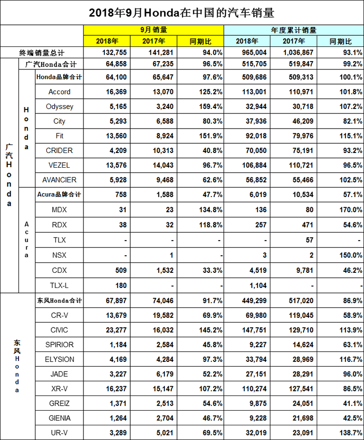 2018年10月9日,Honda发布2018年9月在中国的终端汽车销量。