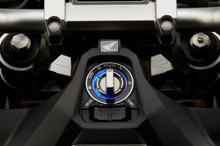 X-ADV为骑手标配了Honda智能钥匙系统,通过采用这一系统,在携带智能钥匙的状态下,按下主开关旋钮在旋钮周围便会发出蓝色光圈,方便驾驶者在暗处判断旋钮的当前位置,方便驾驶者操作。此时转动旋钮便可进行操作的ON/OFF以及车把锁等操作。旋钮下方的翘板式按键是进行坐垫以及加油口盖的开启操作。并且无钥匙启动的功能为骑手们省去了“从口袋中掏出钥匙”的麻烦。