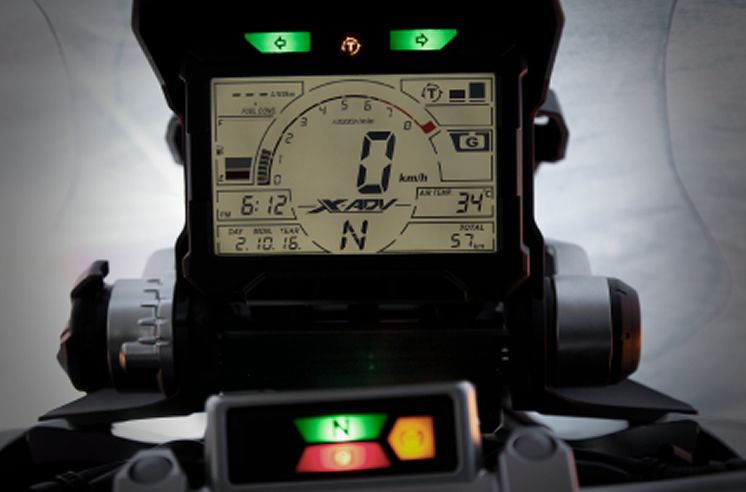 X-ADV全车灯具均采用高亮度LED灯源,形状棱角分明彰显科技与时尚感。并且融入了探险风格的车速表配置,这块全液晶仪表设计风格源自Honda参加达喀尔拉力赛的CRF450 Rally战车。能够显示油耗、存油量、日期时钟、转速、时速、室外温度、总里程/单次里程记录、DCT模式、智能钥匙识别灯、档位等丰富信息。