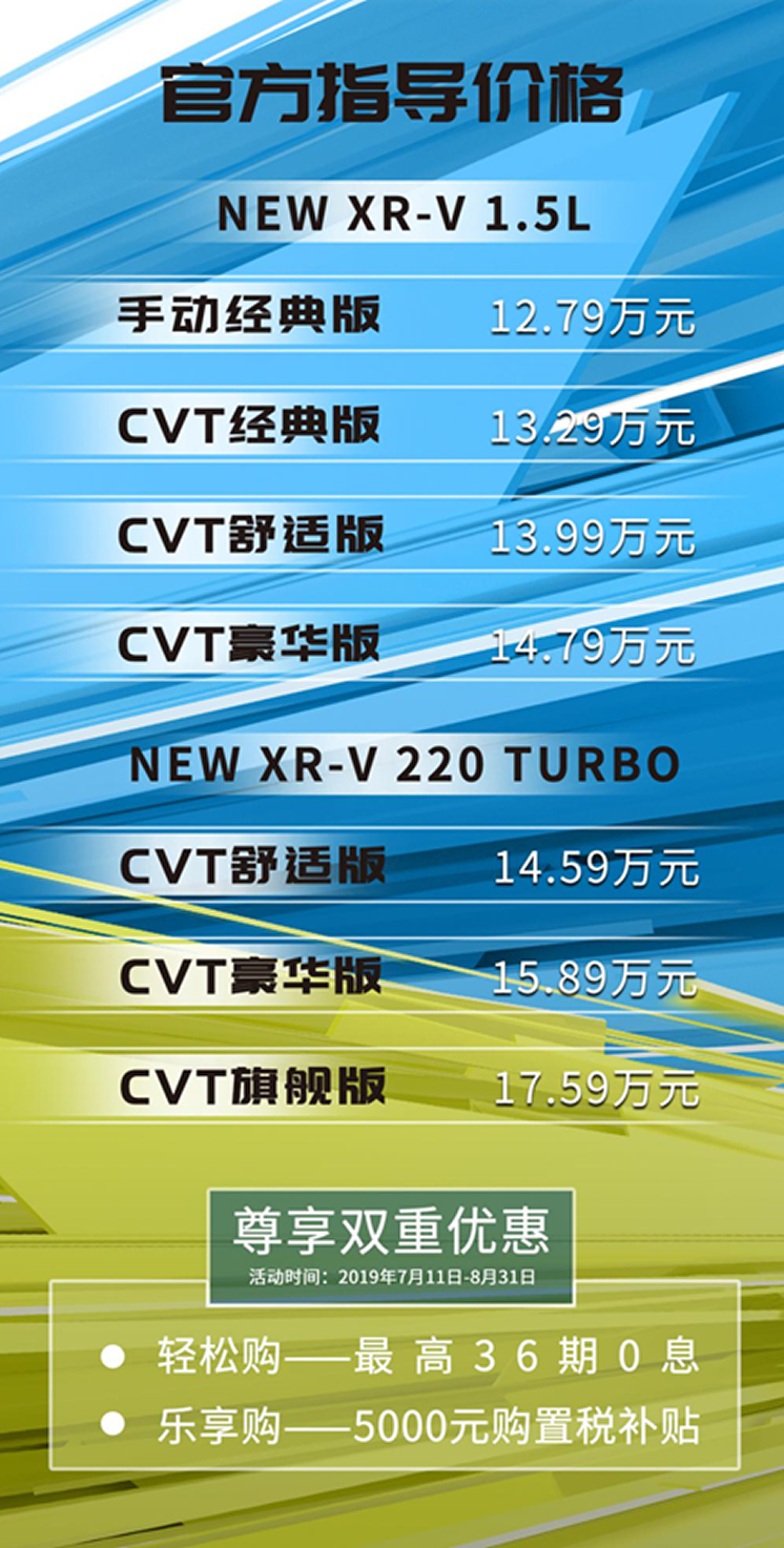 换装220TURBO发动机,同时保留1.5L自然吸气发动机,全新XR-V从原有的5款配置进化为7款配置,将为消费者带来更加丰富、更加个性的选择。全新XR-V售价区间为12.79万元-17.59万元。