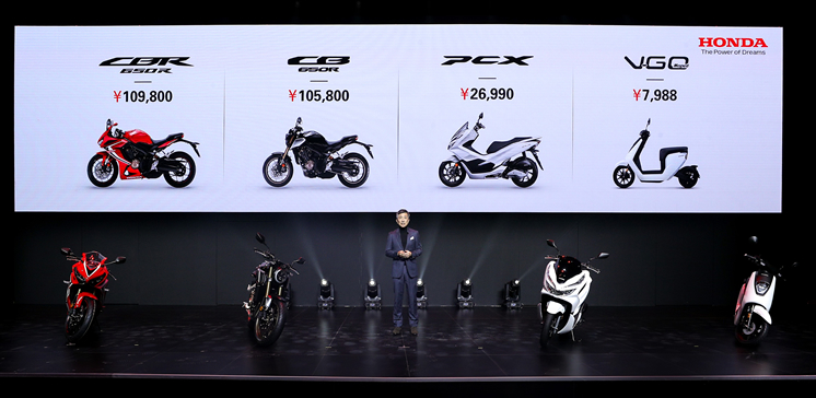 2019年11月8日,本田技研工业(中国)投资有限公司、五羊-本田摩托(广州)有限公司、新大洲本田摩托有限公司在上海成功举办了以“Be Your Style”为主题的Honda新品上市发布会。发布会吸引了众多媒体以及摩托车爱好者的出席,本田技研工业株式会社常务执行董事、中国本部长水野泰秀以及五羊-本田摩托(广州)有限公司董事长陈茂善、新大洲本田摩托有限公司董事长赵序宏等相关领导也出席了发布会。本次发布会共推出四款全新Style新车型,分别是将于11月17日发售的经典复古运动车型CB650R、全新的极致运动跑车CBR650R,经典中小排量踏板车型PCX以及电动轻便摩托车V-GO Moped。官方售价分别为:105,800元、109,800元、26,990元和7,988元。