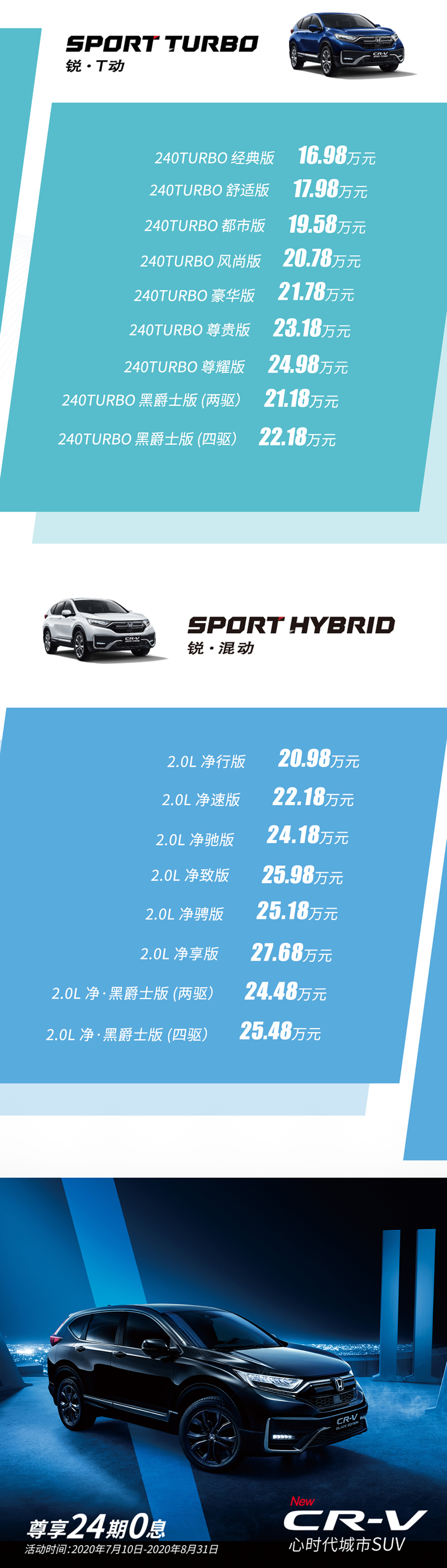 新CR-V共推出锐•T动和锐•混动两种版本共17款车型,市场指导价16.98万元—27.68万元。为方便广大消费者选购,新CR-V上市即同步推出礼享款待:尊享24期0息(活动时间:即日起至2020年8月31日)。