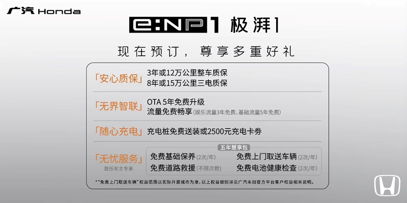 随着全新电动品牌e:NP的推出与首弹车型e:NP1极湃1的首发亮相,5月31日,备受期待的e:NP1极湃1正式开启预售,CLTC续航420km版本与510km版本的官方预售起步价分别为17.5万元与20.5万元,新车将于6月上市。即日起,用户可通过“极湃1”微信小程序、“广汽本田商城”、“广汽本田”APP、广汽本田官网等线上专属直销渠道进行预订,亦可前往陆续开业的“e中心”(电动化销售服务店)与“e空间”(商超店)以及指定广汽Honda特约店进行体验。广汽Honda还为用户制定了诚意满满的订车权益,在上市当天0点前预订e:NP1极湃1(具体上市时间以官方后续发布为准),用户可收获以下预售权益: