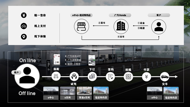 为满足更多年轻客户线上购车的需求,广汽Honda打破渠道与服务的边界,创新性地搭建了全新的、透明的、高效的电动车线上专属直销模式,成为首家同时创建线上直销模式与线下体验模式的合资车企。如今,用户可通过“极湃1”微信小程序、“广汽本田商城”、“广汽本田”APP、广汽本田官网一键购车。广汽Honda电动车线上专属直销模式设定了全国统一售价并采用线上支付形式,用户与广汽Honda线上直连,在线上完成新车下订、合同签署、按揭办理、车款支付等传统购车业务,新车由广汽Honda直销到用户手中,并通过e中心与指定特约店等渠道进行交付。在全新的线上专属直销模式中,广汽Honda直接面对终端购车用户,更深入地了解用户的多样化购车需求,并提供公开透明的价格与简单流畅的流程,为用户带来舒心又放心的全新购车体验。