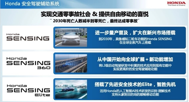 今后的目标是,到2030年,在全球的全系汽车上都将搭载具有感知二轮车功能的Honda SENSING;安全超感Honda SENSING 360搭载到先进市场的全系汽车车型。通过功能的持续升级,到2030年,实现在全球范围内涉及Honda二轮车和汽车的交通事故死亡人数减半的目标。