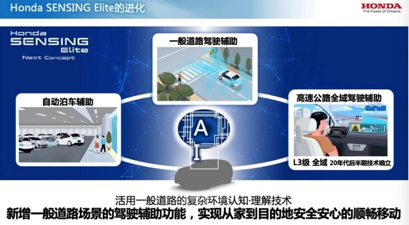 Honda SENSING的旗舰技术Honda SENSING Elite进一步升级。通过像人类一样积累经验不断成长的Honda的人工智能AI技术,Honda研发出识别各种复杂场景和应对一般道路复杂环境的功能,比如覆盖在一般道路的从家到目的地,实现安全安心的顺畅移动。具体为:包括城市主干道堵车时的脱手功能、在高速公路的出入口汇合或驶出时的脱手功能、在自家出库/入库时的自动泊车辅助功能。该技术将于2020年代后半期开始搭载应用。