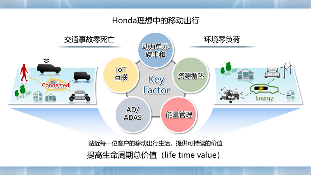 Honda希望通过推进“环境零负荷”,以及“涉及Honda二轮、四轮车交通事故零死亡”,提供自由移动出行的乐趣,帮助更多人实现梦想,成为推动社会前进的动力。为实现这一富有挑战性的目标,Honda将进一步强化业务体质,并将以下5点作为推动移动出行升级的关键要素,着力加以推进。