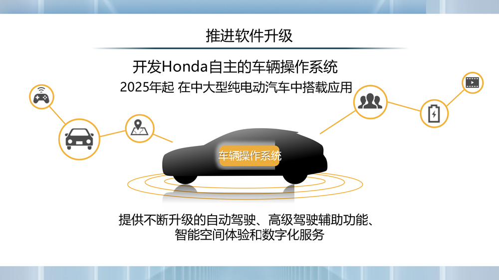 具体来看,将以2025年在北美推出的中大型纯电动车中进行搭载应用为目标,进一步优化电子电气架构,同时推进开发Honda自主车辆操作系统,并以该系统为基础,不断推进车载软件的优化升级,使车辆在售后能够继续得到功能和服务的提升。