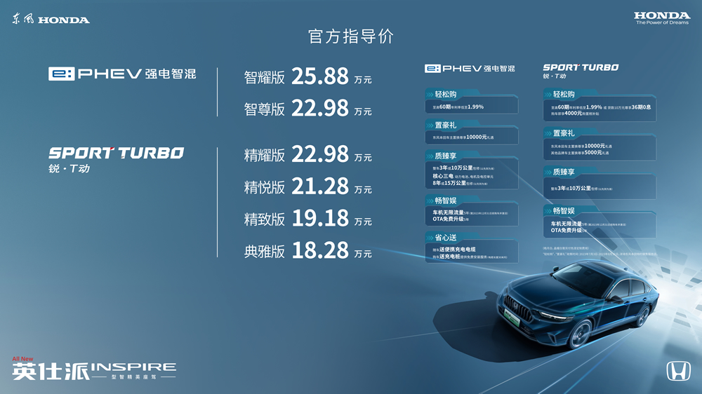 智领先行,驭电新生。7月3日,东风Honda旗舰轿车全新英仕派在世界互联网大会举办地——乌镇正式上市,新车首次推出e:PHEV插电混动版本,官方指导价18.28-25.88万元。全新英仕派定位“型智精英座驾”,在造型设计、动力系统以及智能配置等方面全维进化,重塑智电时代旗舰轿车价值新标杆,为睿智理性、积极进取的“型智精英”带来高品位个性之选。