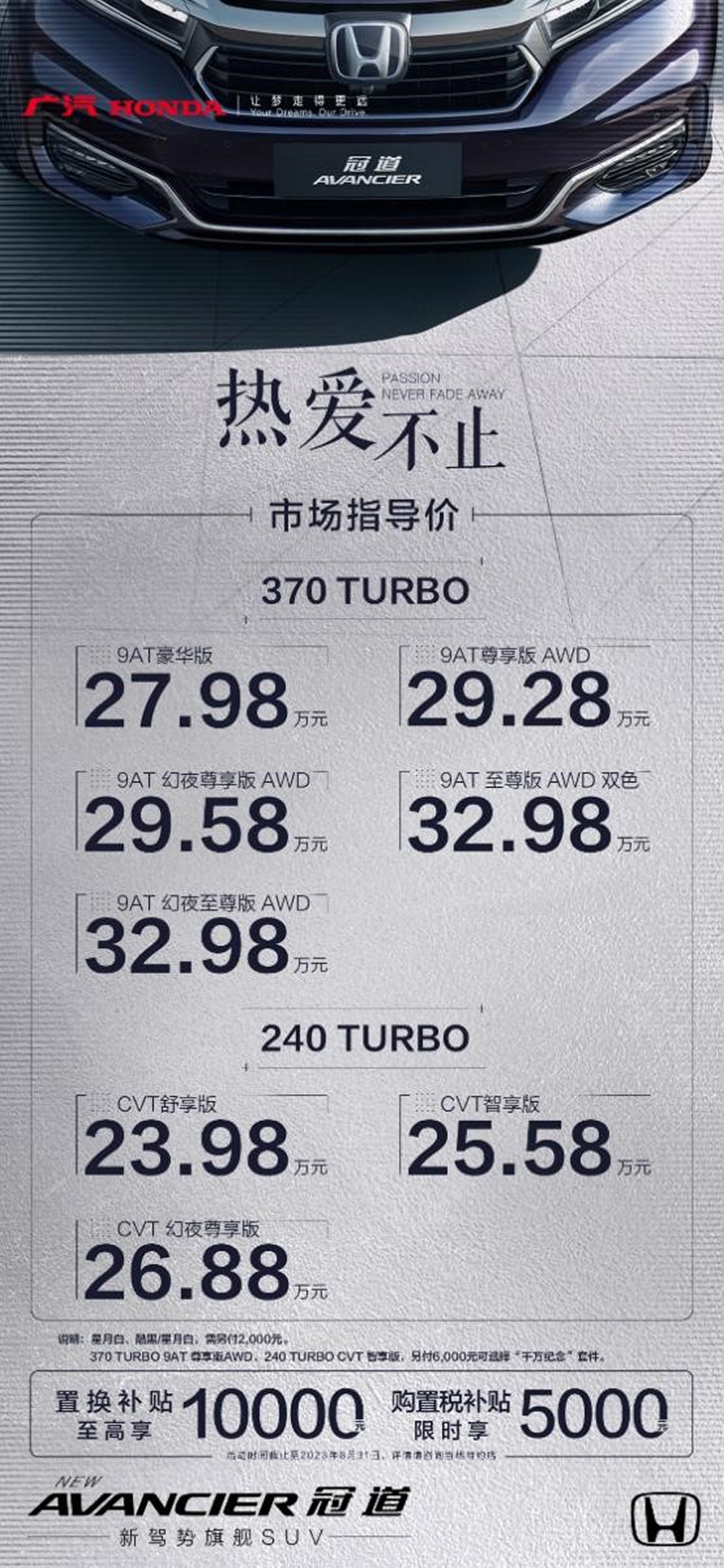 8月8日,驭见热爱之道,定位为“新驾势旗舰SUV”的广汽本田新款冠道正式上市,新车共推出8个车型版本,市场指导价为23.98-32.98万元。其中,智享版和尊享版车型可选装“千万纪念”套件。即日起,用户可前往广汽本田特约店进行试驾体验并预订。广汽本田还为用户送出诚意满满的订车权益,至高享10,000元置换补贴,限时享5,000元购置税补贴(政策时间截止至2023年8月31日)。