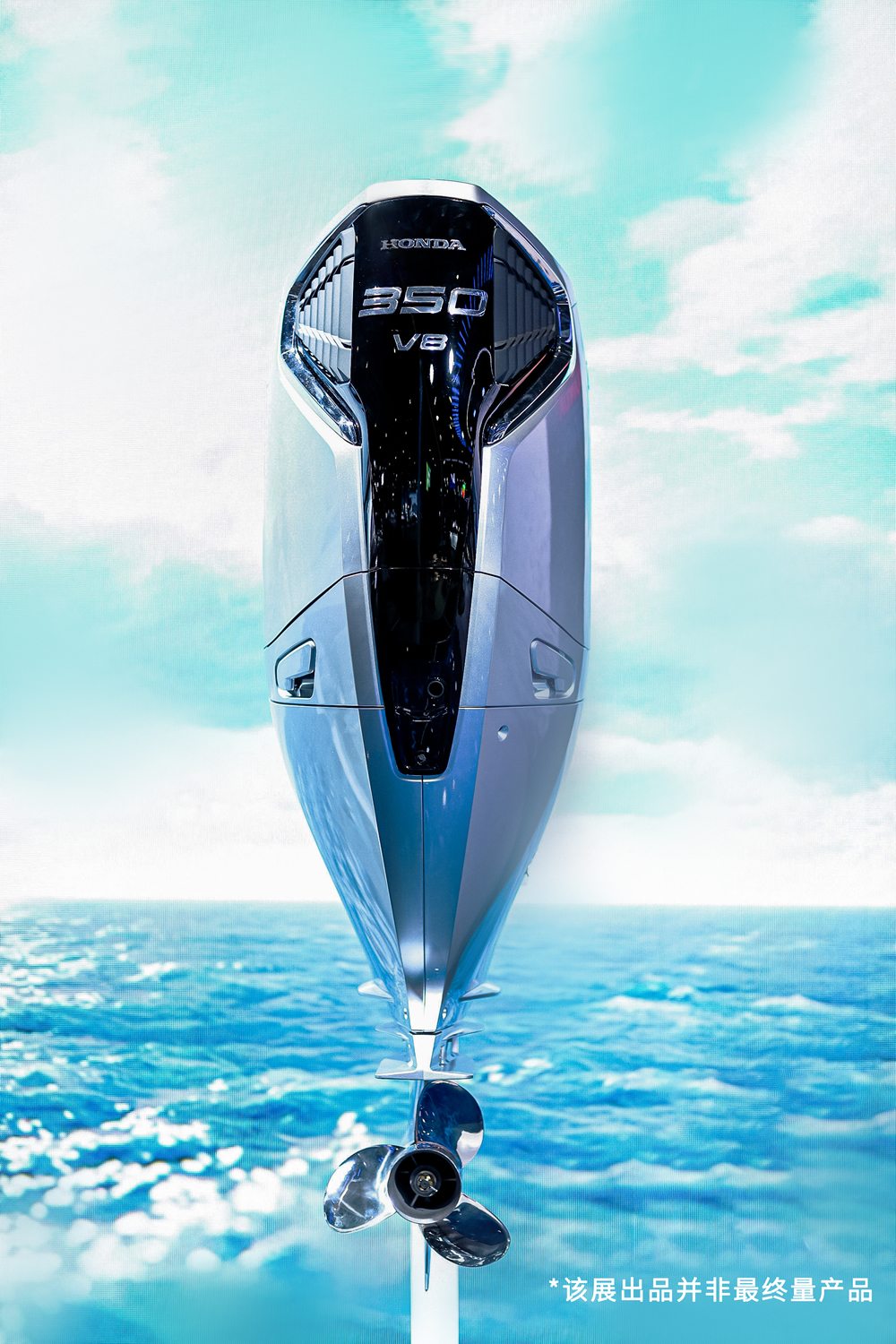 Honda船外机旗舰机型BF350首次在中国展出。在动力方面,BF350采用了崭新特别设计开发的V8发动机,最大输出功率可达350马力,排量达4,952cm³,动力强劲,是Honda船外机系列之最;在造型方面,其沿袭了本田船外机的一贯设计理念,即人与自然的一体感,拥有可与多型船艇设计相匹配的简洁清爽的外观,并且打造出了旗舰机型特有的上乘质感;在性能方面,其扩充了船舶操控支持功能,提高了驾驶期间乃至停泊和存放时的便利性,使航行更加平稳舒适。BF350兼具品质感和强劲的动力性能,满足海上大型游艇休闲需求,让驾驶员及乘船人员真正享受到巡航的乐趣。